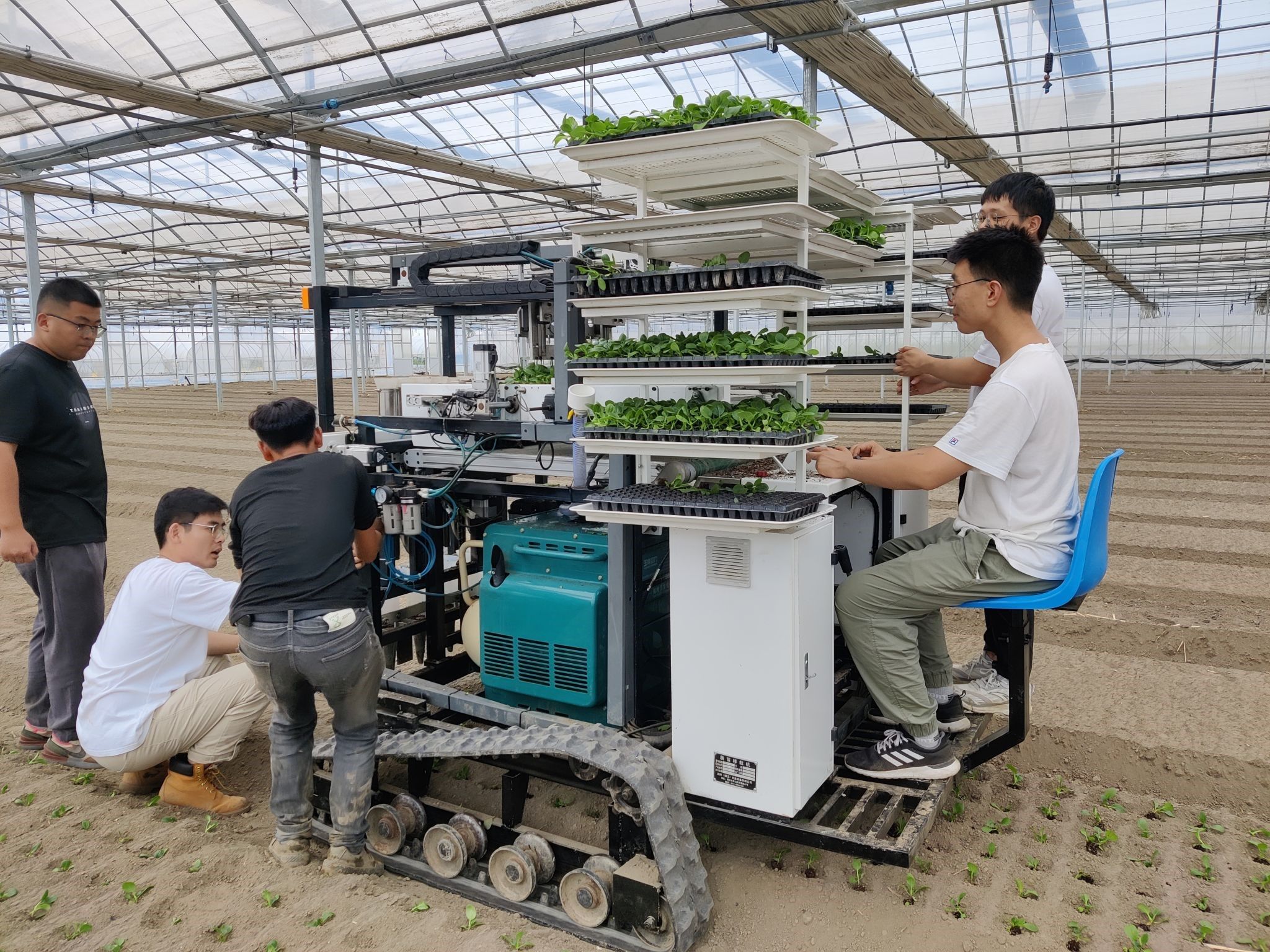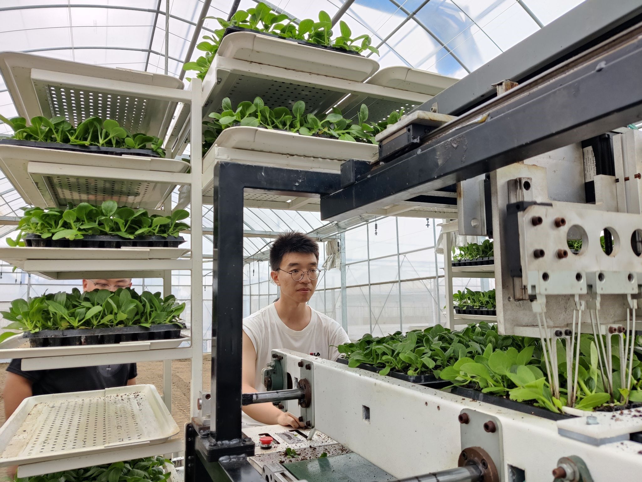 在金开(上海)农业科技有限公司的大型温室内,团队青年学生时佳威在胡教授的认真指导下,使用六行密植全自动蔬菜移栽机种植上海青。该机器采用162孔普通硬塑穴盘,操作简单,使用成本低、适应性强,是专门针对上海青等小株距、小行距叶菜定制的新型移栽机。