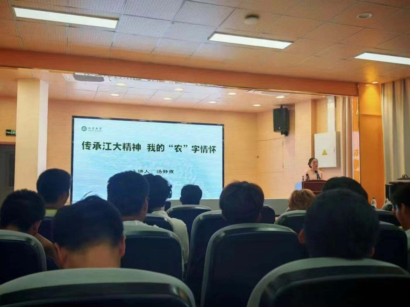国庆节前夕,校关工委副主任、校“中国共产党人精神谱系”讲师团成员汤静霞受邀在学苑楼二楼报告厅开设以“传承江大精神--我的“农”字情怀”为主题的信仰公开课。欧亿体育·(中国)官方网站2024级全体本科生新生到场学习,学院党委书记廖志凌、团委书记申成斌共同参加活动。