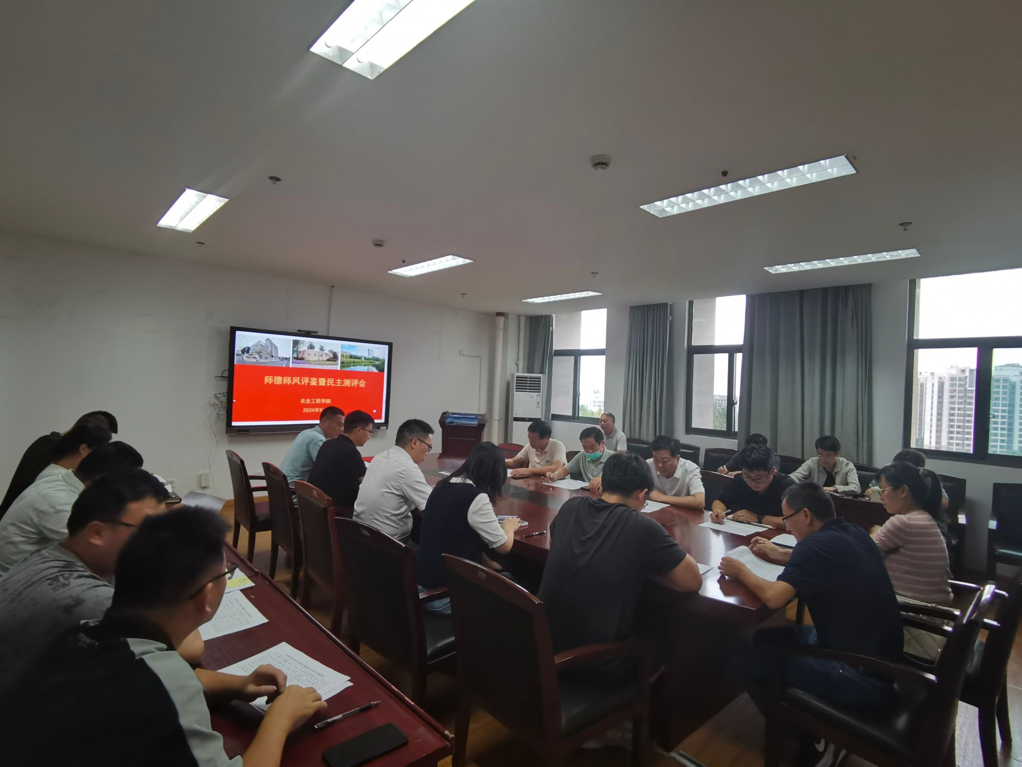 王文元、戴世群、李雨欣等9位来自管理、教学、科研等条线的教师现场汇报了个人的思想政治修养、学术科研及育人工作,以及对照职称评审条件取得的相关成果等。与会师德工作组成员、教师代表分别对9位同志进行了测评打分。